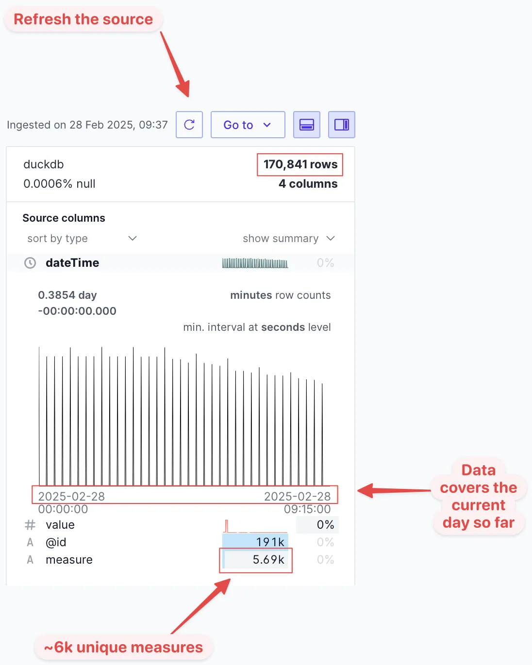 Let’s head back to Rill (after closing my DuckDB CLI session, since two sources can’t work with the DB by default) to see what the updated readings data looks like: